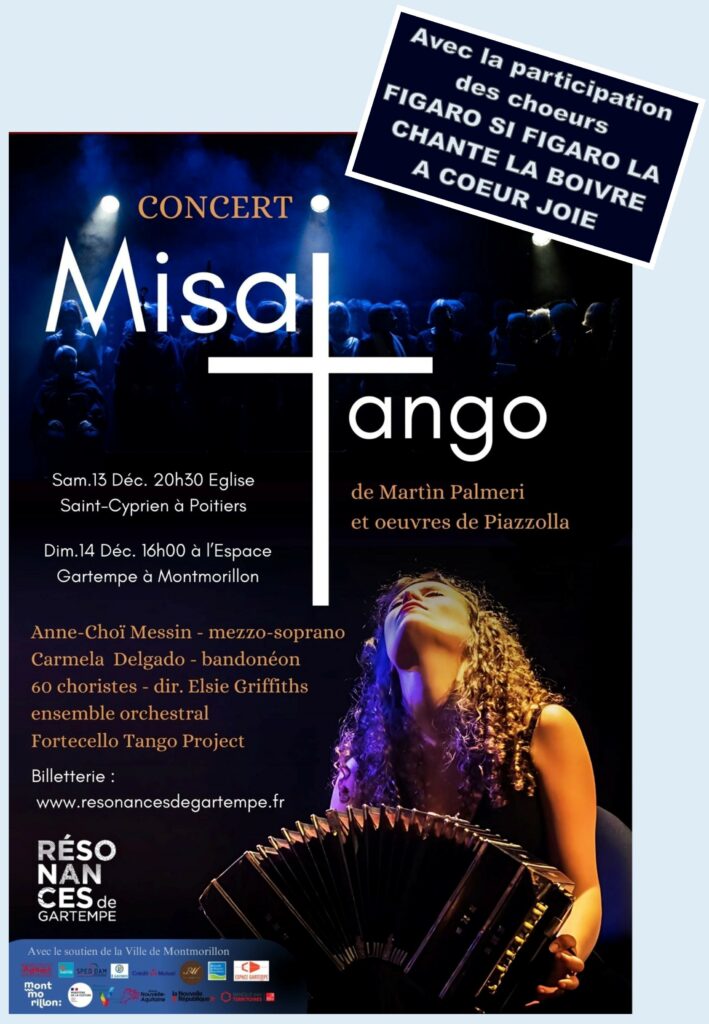 Créée il y a 20 ans par le compositeur argentin Martín Palmeri, MisaTango est une messe chorale sur des sonorités de Tango. Elle est composée sur les mêmes mouvements qu’une messe en latin classique, à laquelle se mêlent les harmoniques et les rythmes syncopés du tango. Le compositeur introduit en outre l’instrument emblématique du tango, le bandonéon, soliste aux côtés d’un orchestre à cordes (violons, violoncelles et contrebasse) et du piano. Une partie de mezzo-soprano solo vient ponctuer l’œuvre, répondant au chœur mixte.